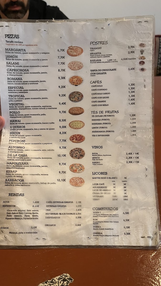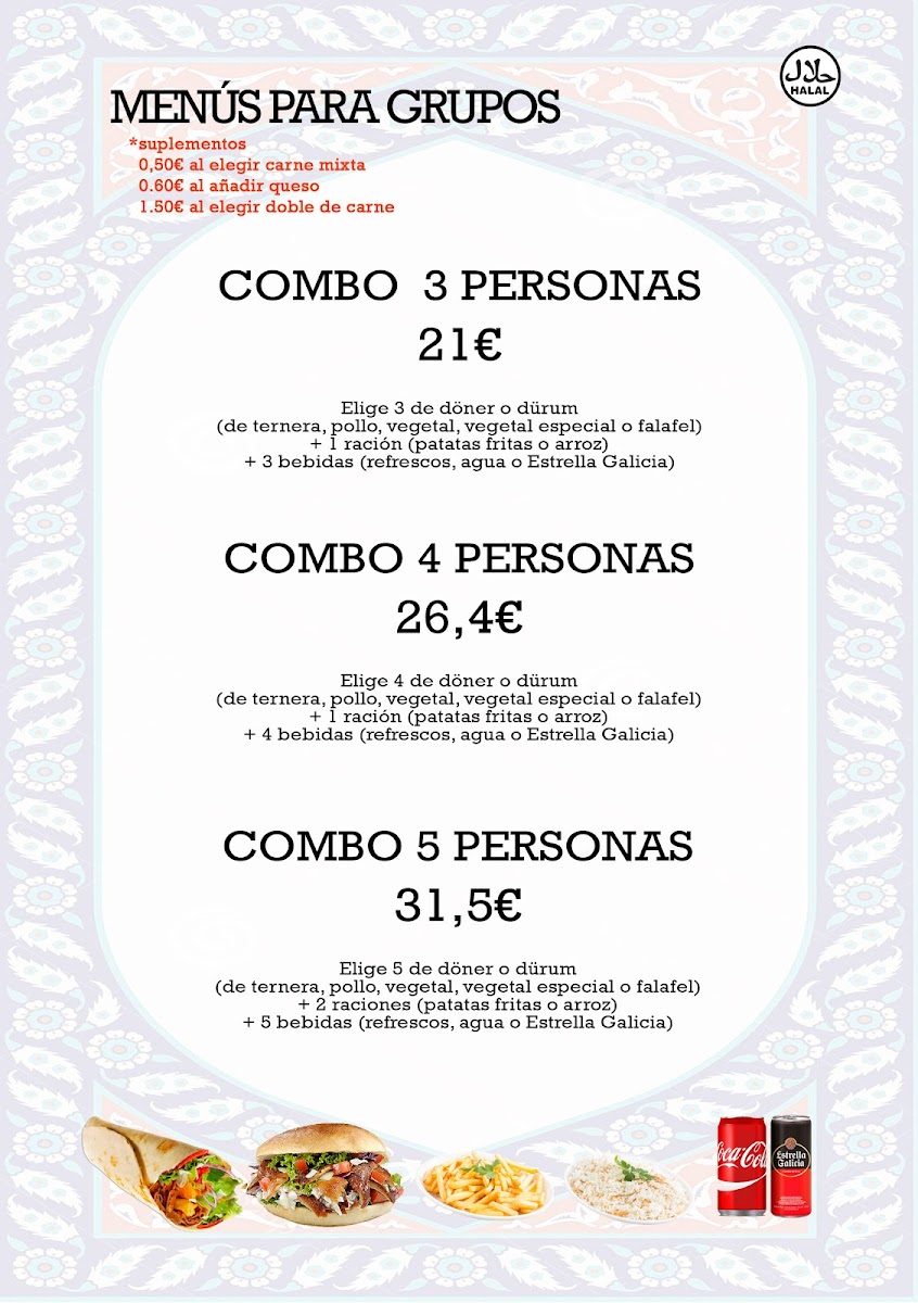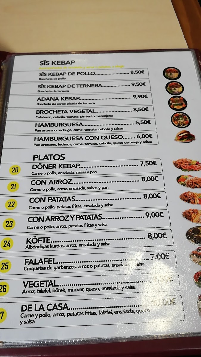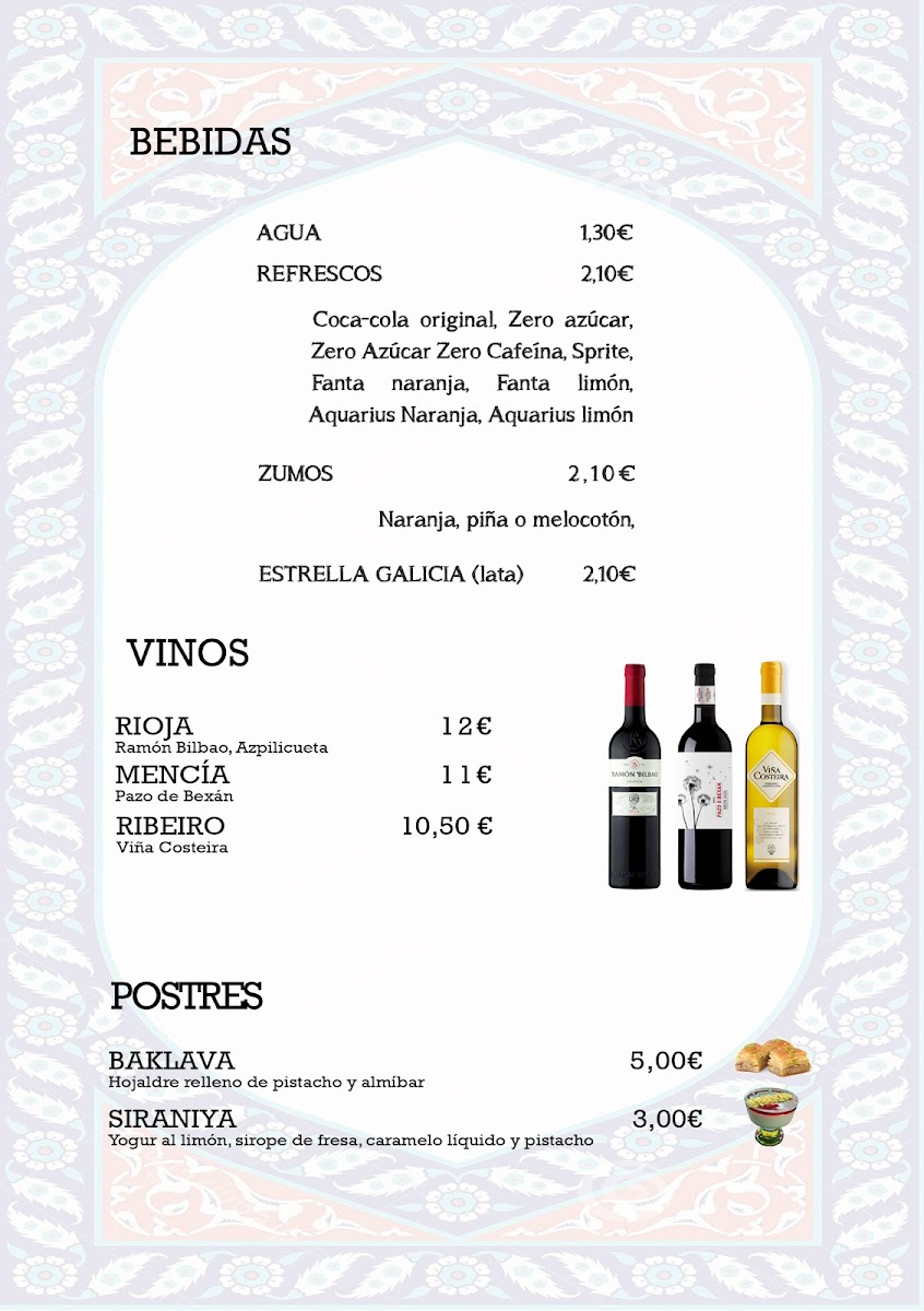 For those seeking complete meals, there are combination plates such as kebab served with potatoes and mixed salad, as well as meat dishes accompanied by salad and rice. Desserts include traditional items like baklava. Beverage options include local beers such as Cerveza 1906.