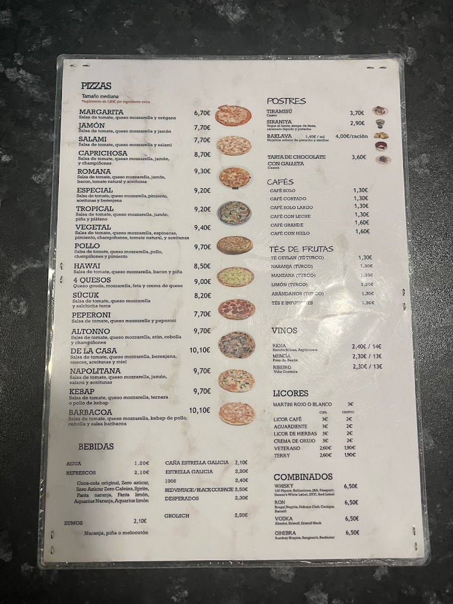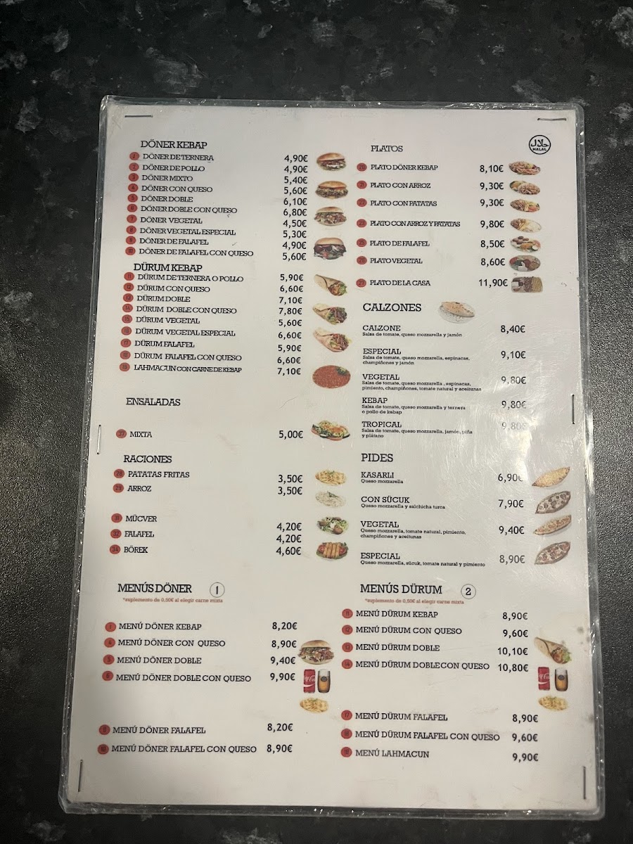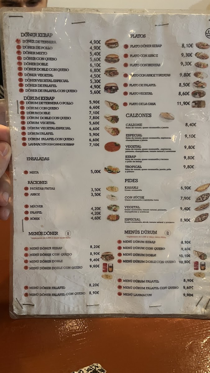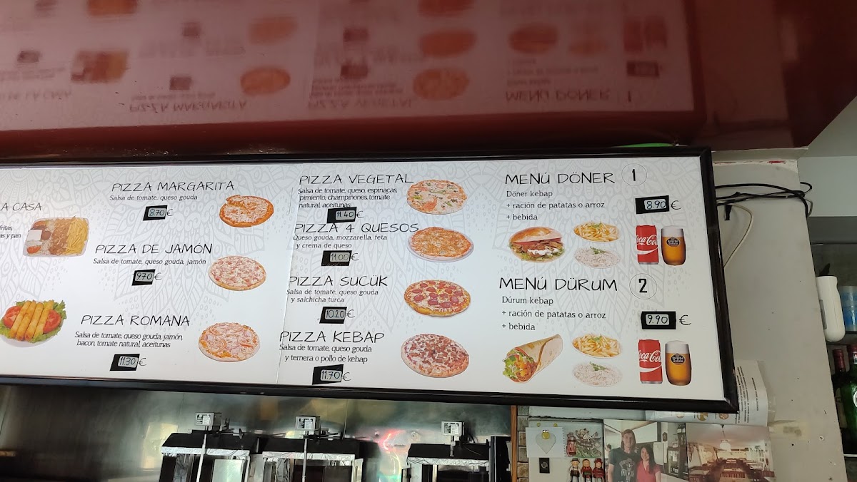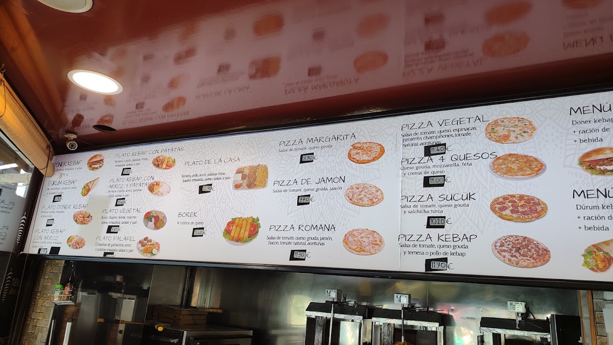 The menu offers a variety of options combining Turkish and fast food with pizza selections. It features a range of kebabs including dürüm and mixed meat doner kebabs, alongside vegetarian choices such as falafel and hummus. Additionally, the menu includes pizza options like Pizza Kebab, Pizza Romana, and Calzone Vegetal, providing diverse meal choices.